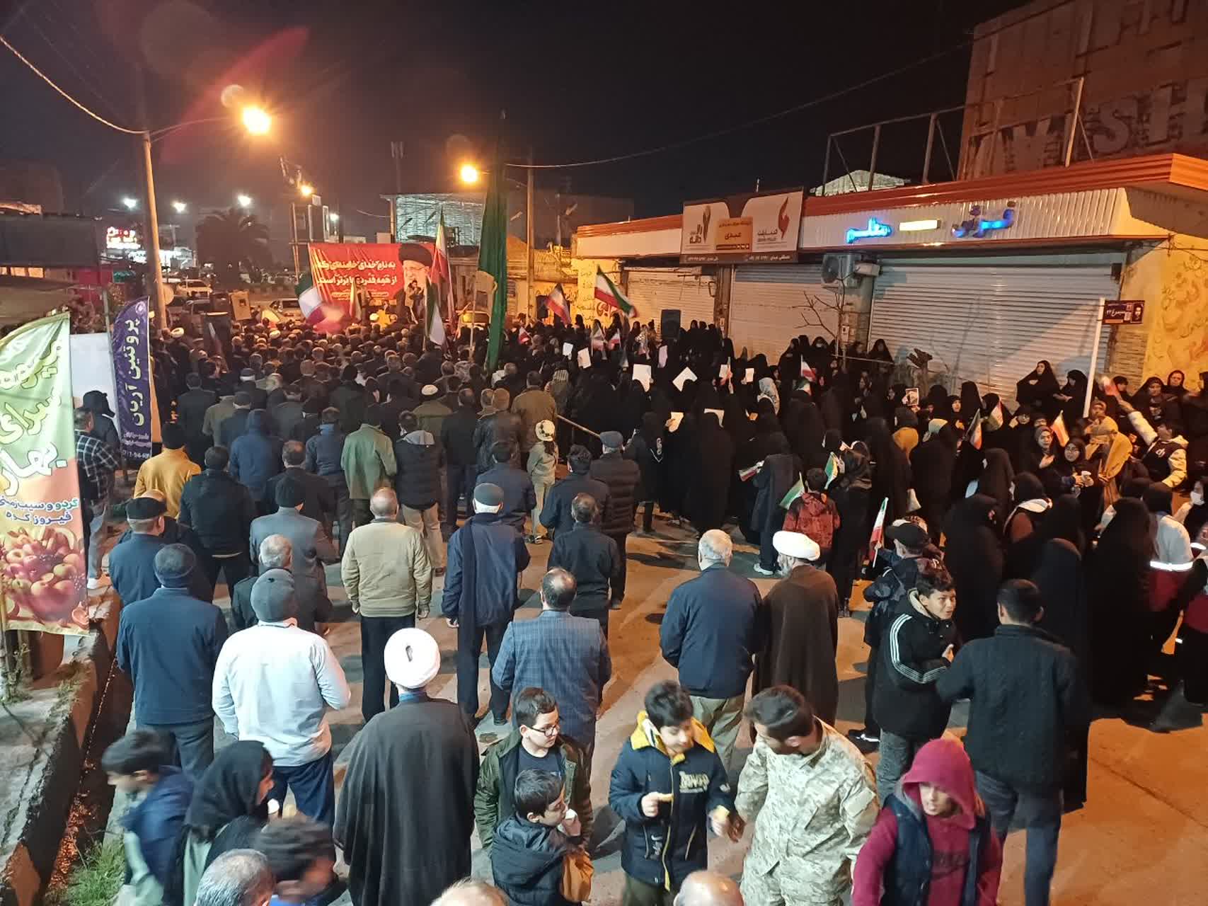 به گزارش پایگاه خبری آوای سیمرغ، مردم همیشه در صحنه شهرستان سیمرغ شامگاه چهارشنبه ۱۵ اسفند با حضور گسترده در راهپیمایی مردمی، بار دیگر روحیه استکبارستیزی و وفاداری خود به آرمانهای انقلاب اسلامی و خون پاک شهیدان را به نمایش گذاشتند.